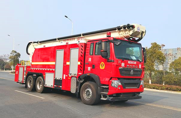 JP32米舉高噴射消防車是選用中國重汽T系列豪沃消防車底盤,原廠單排雙開門駕駛室,可載含駕駛員在內的乘員2人,駕乘舒適輕便;集水罐車、泡沫車、高噴車三者功能與一身,具有高層滅火、火場監控、快速作戰等國內先進水平的高性能多功能消防車。該車采用電液比例及下車集中控制技術,是全液壓驅動、伸縮加折疊臂式消防車;同時該車自帶7噸水罐及2噸泡沫罐,可在距離水源較遠的位置完成消防作業。該車綜合應用新技術、新工藝、新材料并結合自身技術優勢,豐富高噴車的功能配置,提高了高噴車的單車作戰能力。